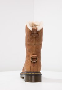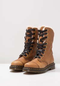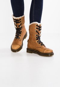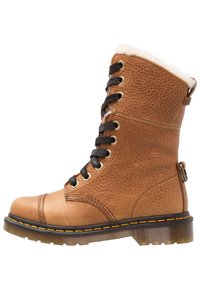 Bottes en cuir marron à lacets noirs avec doublure en fourrure blanche, portées avec un jean bleu foncé, debout sur un sol blanc brillant.