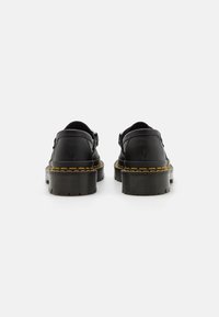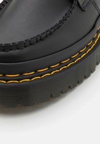 Mocassins en cuir noir avec une semelle en caoutchouc noir épaisse et des coutures jaunes. Présente un détail de sangle décorative et un devant de style mocassin.