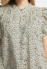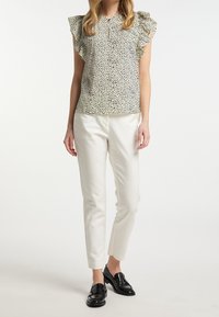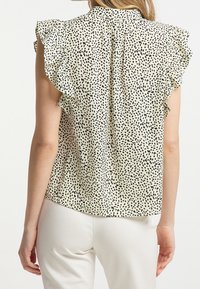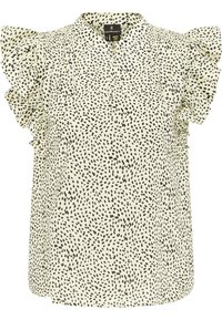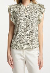 Femme portant un chemisier crème avec un motif de points noirs irréguliers et des manches courtes à volants, associé à un pantalon blanc.