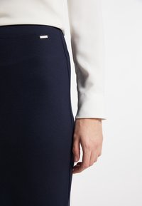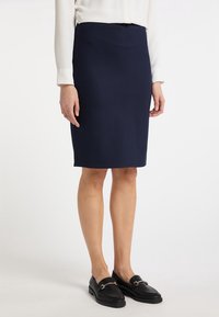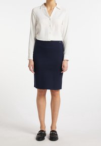 Jupe crayon marine en tissu extensible, mi-longue, avec une texture lisse et une ceinture élastique pour le confort. Associée à des mocassins noirs.