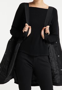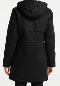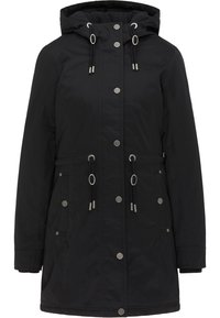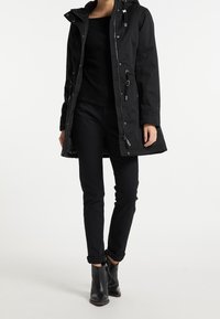 Parka longue noire à capuche avec boutons sur le devant, cordons de serrage réglables à la taille et poches, portée sur des vêtements noirs.