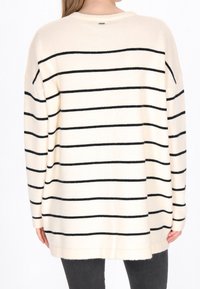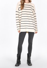 Femme portant un pull crème oversize à rayures horizontales noires, manches longues, et un pantalon foncé, les mains jointes devant elle.