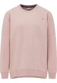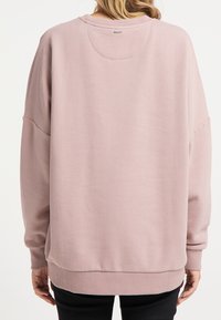 Femme portant un sweat-shirt ample à col rond de couleur rose clair avec un petit logo brodé sur la poitrine, assorti à un pantalon noir.
