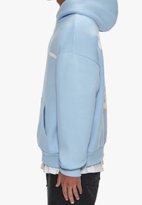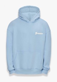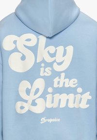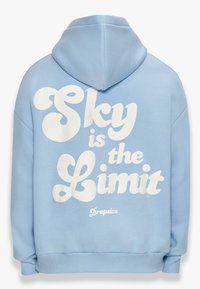Sweat à capuche bleu clair avec texte blanc "Le ciel est la limite." Dispose de poignets et d'un ourlet côtelés, fabriqué en tissu doux et texturé.