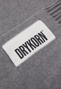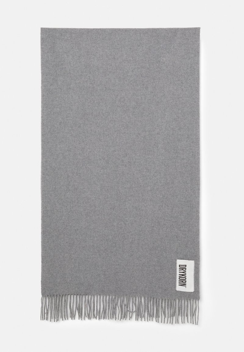 Écharpe en laine gris clair unie avec des extrémités à franges et une étiquette rectangulaire blanche affichant le nom de la marque "DRYKORN" en lettres noires.