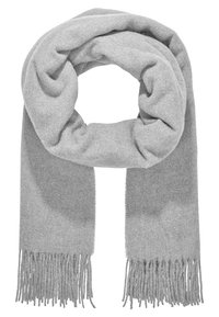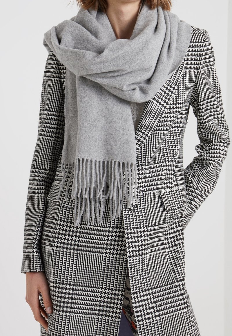 Femme portant un manteau pied-de-poule noir et blanc, les mains dans les poches, avec une grande écharpe gris clair à franges enroulée autour du cou.