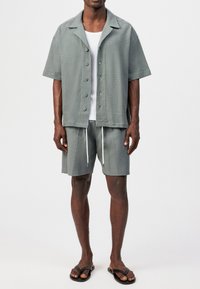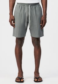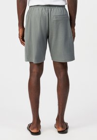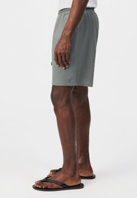 Homme portant un short gris texturé avec des cordons blancs et des tongs noires, debout devant un fond blanc uni.