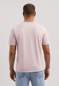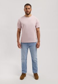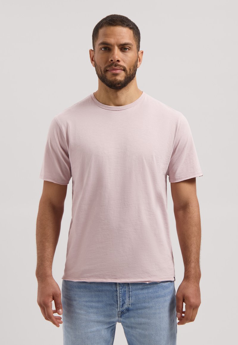 Homme aux cheveux courts et barbe portant un t-shirt rose clair à manches courtes et un jean bleu clair, debout devant un fond uni.
