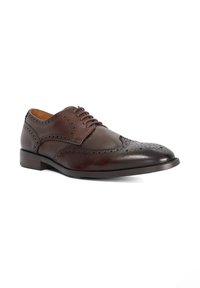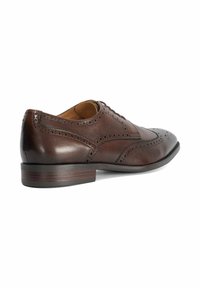 Chaussure Oxford masculine en cuir marron avec détails brogue et talon empilé bas, vue de profil droit sur fond blanc.