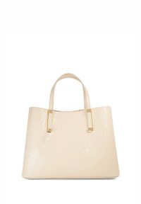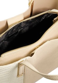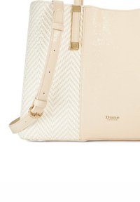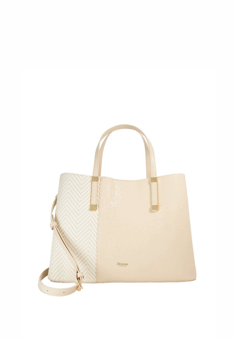 Sac cabas beige avec poignées doubles, bandoulière amovible et panneau à texture tissée sur le côté gauche, marqué "Dune London" au centre avant.