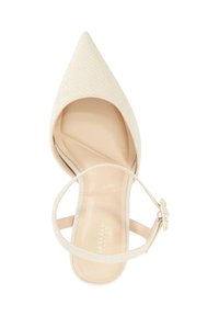 Jambes portant des chaussures à talons hauts blanches à bouts pointus avec des brides autour de la cheville et des boucles décoratives en perles sur un fond clair uni.