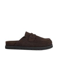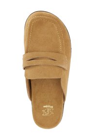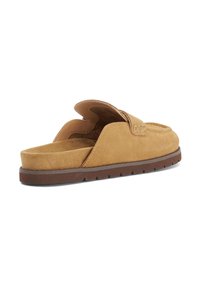 Mule mocassin en daim beige à enfiler avec dessus cousu, bride décorative et semelle en caoutchouc marron, présenté de profil sur fond blanc.