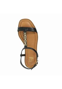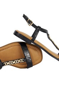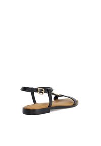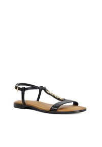 Sandales en cuir noir avec une finition texturée, bride de cheville ajustable, semelle plate, détails en accent doré et design à bout ouvert.