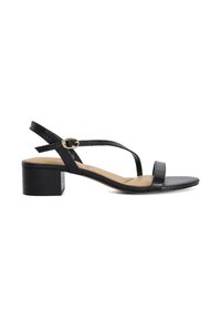 Jambes portant des sandales blanches à talons bas avec des fines lanières et un talon bloc en bois sur un fond blanc uni.