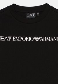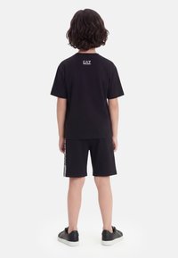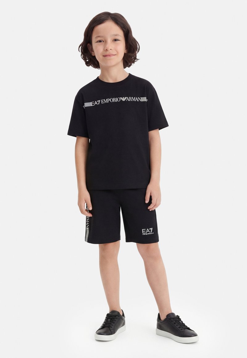 Enfant aux cheveux mi-longs portant un t-shirt noir EA7 Emporio Armani, un short assorti et des baskets noires, debout sur fond blanc.
