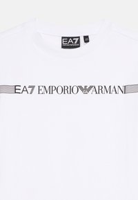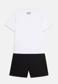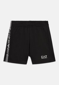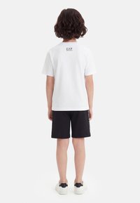 Enfant souriant aux cheveux courts et foncés portant un t-shirt blanc EA7 Emporio Armani, un short noir et des baskets blanches, debout avec les jambes croisées.