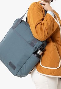 Personne portant une veste matelassée moutarde, transportant un sac cabas bleu avec une poche extérieure, tenant une bouteille d'eau noire et argentée.