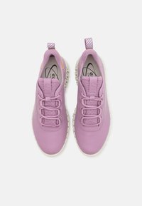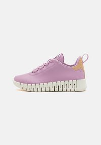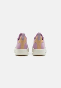 Baskets synthétiques roses avec dessus lisse, semelle blanche épaisse et accent marron clair au talon. Caractérisées par une pointe ronde et un laçage à l'avant.