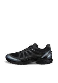 Personne portant des chaussures de sport blanches et argentées avec des chaussettes bordeaux et un pantalon violet clair à ourlets élastiques, debout sur un fond uni.