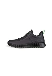 Chaussures de sport noires en matériau synthétique, avec une surface texturée, des accents verts sur les œillets, et un design de semelle segmentée.