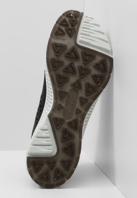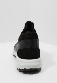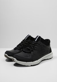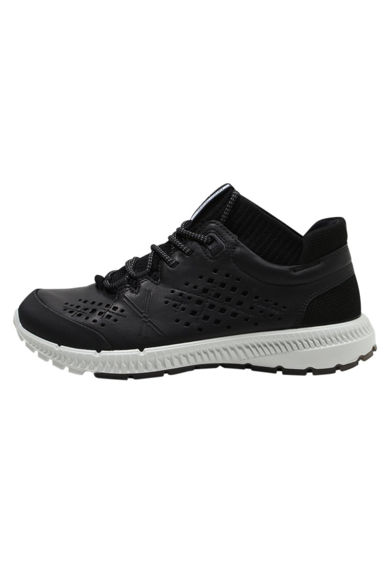 Baskets basses noires avec côtés perforés, semelle blanche épaisse et lacets noirs, vues de profil sur fond blanc.