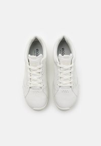 Chaussure de sport blanche avec tige en cuir lisse, accents texturés, et une semelle extérieure en caoutchouc comportant de petites pastilles antidérapantes. Les lacets sont assortis à la couleur de la tige.