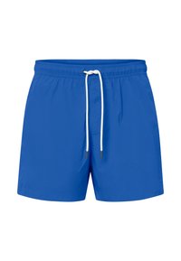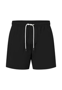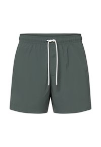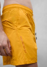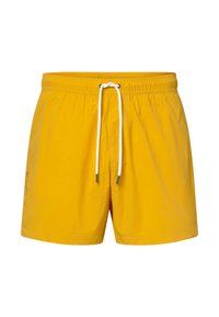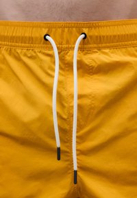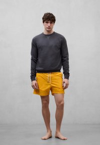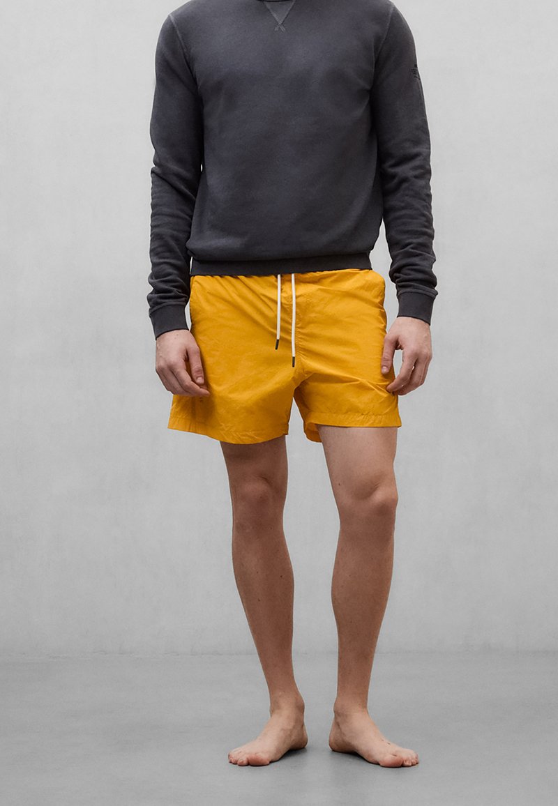 Homme portant un sweat-shirt à manches longues gris foncé et un short à cordon de serrage jaune vif, debout pieds nus sur un sol gris devant un mur uni.