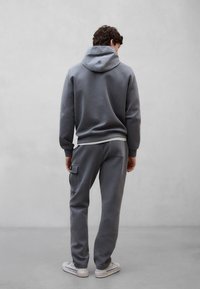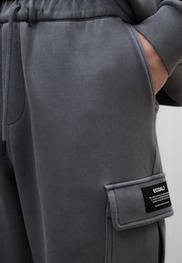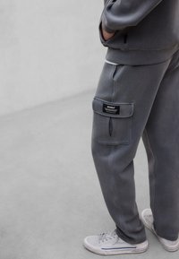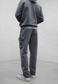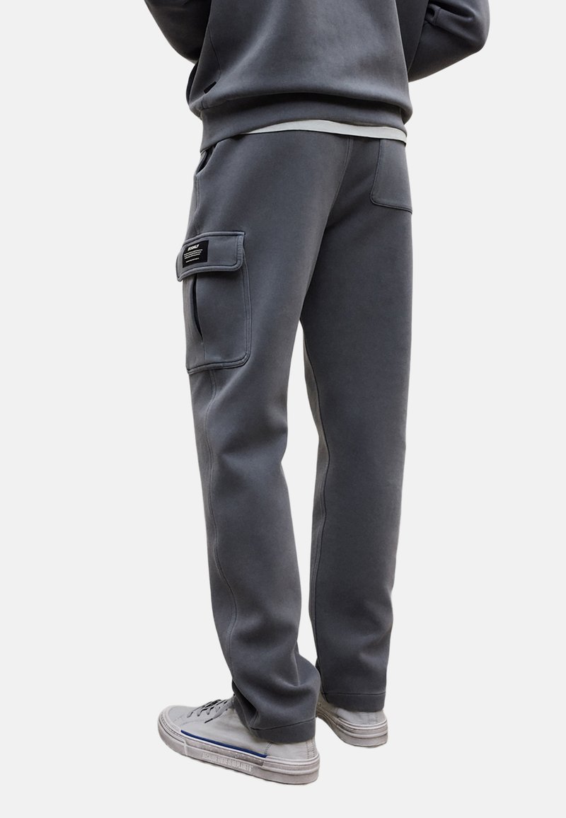 Personne portant un pantalon de survêtement gris foncé avec une poche cargo latérale et des baskets gris clair, debout de dos face à la caméra.