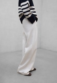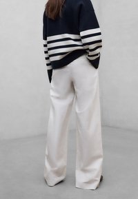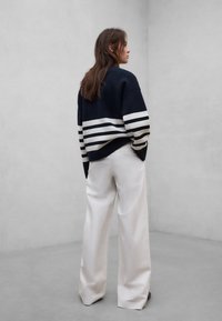 Personne portant un pull bleu marine à rayures blanches, un pantalon blanc à jambes larges et des chaussures tissées foncées, debout devant un fond gris uni.