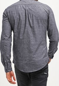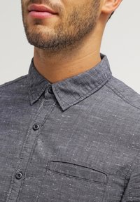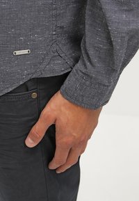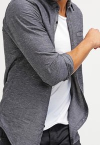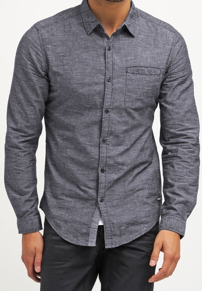 Chemise à manches longues en tissu tissé gris foncé avec des petites taches claires. Comprend une poche poitrine et un ourlet arrondi.