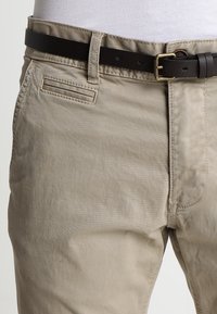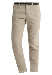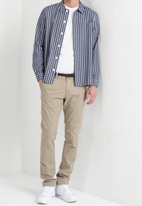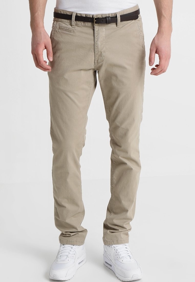 Chinos en coton beige à coupe slim, avec une poche avant et des passants pour ceinture, assortis à des baskets blanches. Texture lisse et détails minimaux.