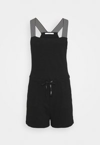 Rompers noirs avec des bretelles rayées ajustables, un corsage ajusté, une taille à cordon et un short. Confectionné dans un tissu léger, de design décontracté.
