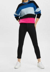 Personne portant un pull douillet à blocs de couleur, pantalon slim noir, baskets blanches, debout les mains en poche sur un fond blanc.