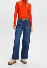 Ceinture en cuir marron avec une boucle en argent, portée sur un jean en denim bleu, associée à un pull à col roulé orange ajusté.