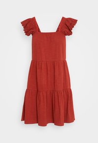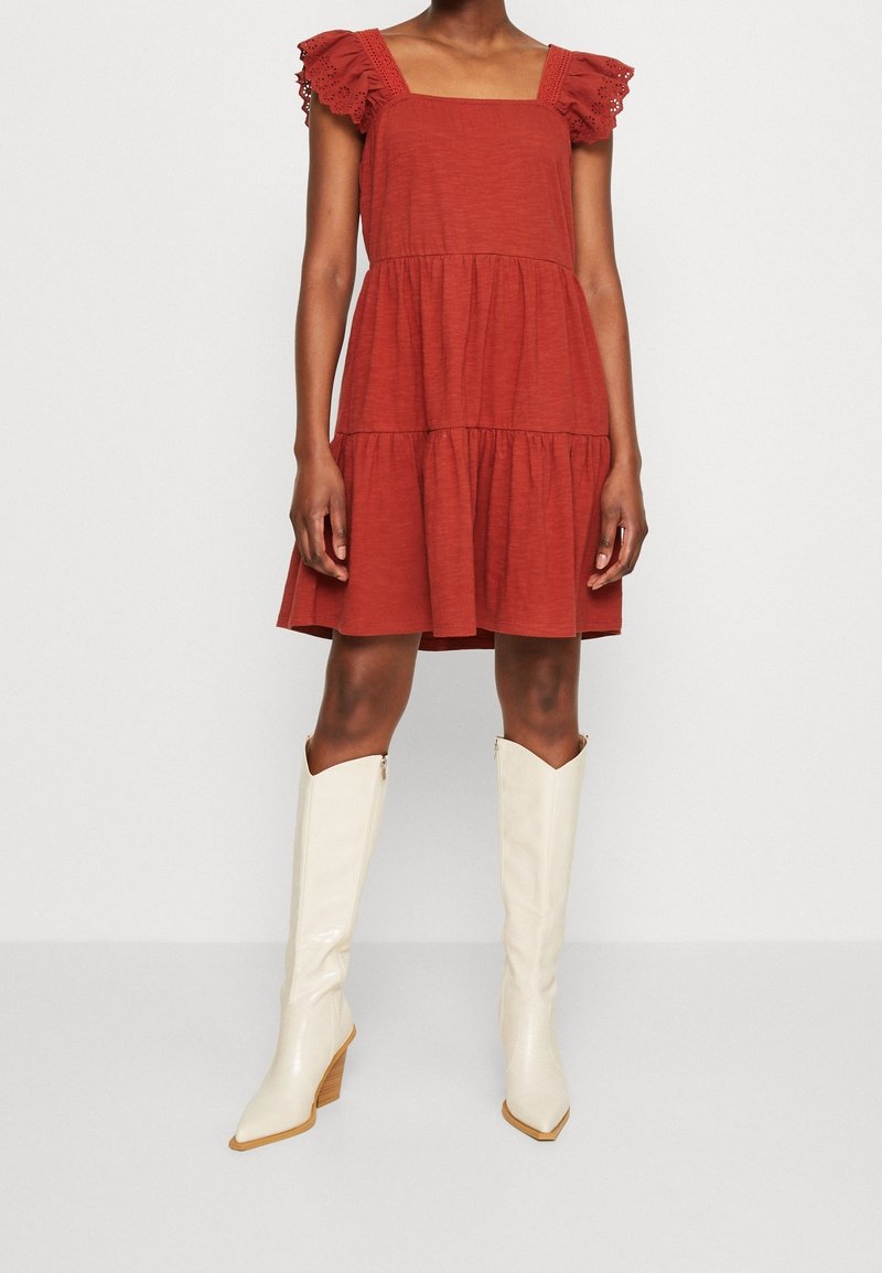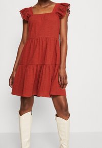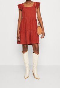 Femme portant une robe mini échelonnée couleur rouille avec des manches esprit œillet et des bottes blanches à bout pointu, hauteur genou, avec des talons en bois.