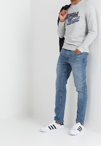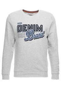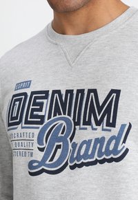 Sweat-shirt gris à col rond, arborant le texte audacieux « Esprit Denim Brand » en bleu foncé. Tissu texturé ; poignets et ourlet ajustés. Porté avec un jean bleu.