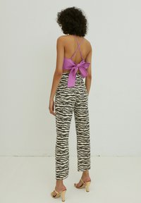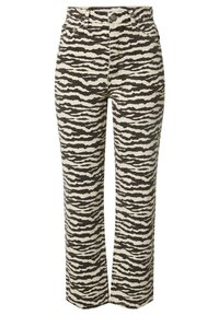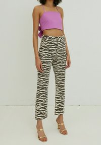 Jean taille haute à rayures zébrées dans des tons de beige et noir, avec une coupe droite et une fermeture à boutons à l'avant. Porté avec des sandales dorées.