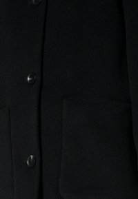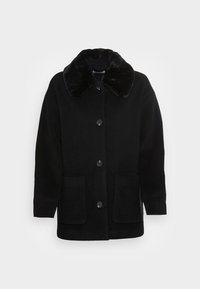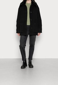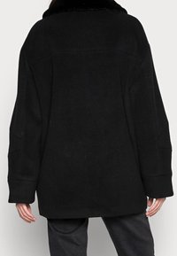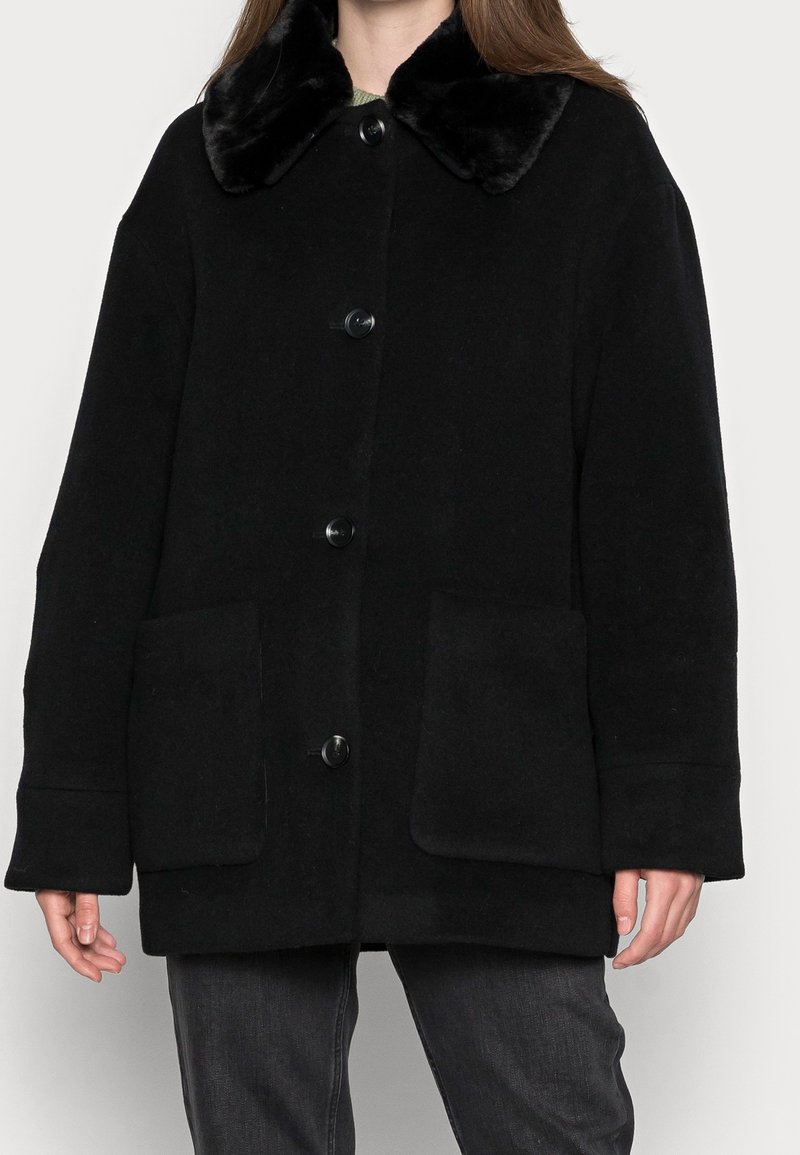 Manteau en laine noir avec de gros boutons, deux poches avant et un col en fourrure douce, porté avec un jean foncé.