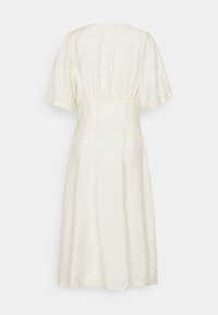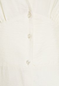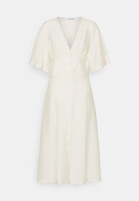 Robe en lin couleur crème avec un col en V, des manches courtes volantées et un devant boutonné. Elle présente un corsage ajusté et une jupe fluide.