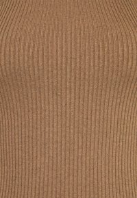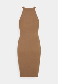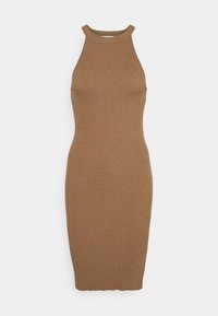 Robe bodycon marron à côtes, sans manches, avec un col haut, fabriquée en tissu extensible, texture lisse, design longueur genoux.