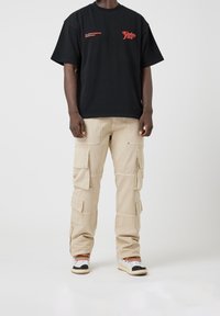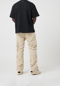 Homme portant un pantalon cargo beige avec plusieurs poches, un t-shirt noir et des baskets blanches avec des lacets rouges et jaunes, debout de profil.