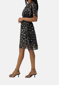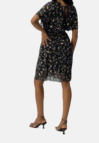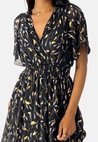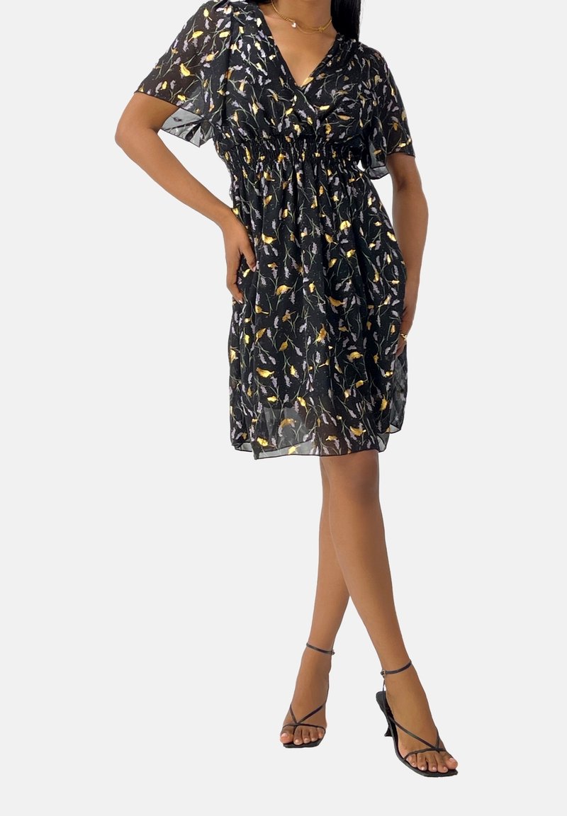 Robe noire à fleurs avec de courtes manches volantées et un décolleté en V, présentant une taille ajustée et une silhouette fluide. Porte des talons noirs à lanières.