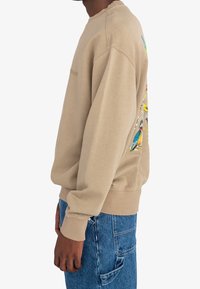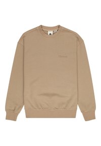 Homme portant un sweat-shirt beige à manches longues et col rond avec le logo "Element" sur la poitrine, et un jean en denim bleu, debout devant un fond uni.