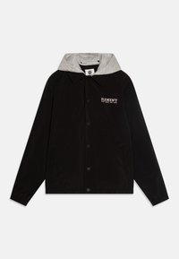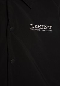 Veste noire avec une capuche grise, dotée d'une fermeture à boutons, de deux poches latérales et du logo "ELEMENT" brodé sur la poitrine. Texture lisse.