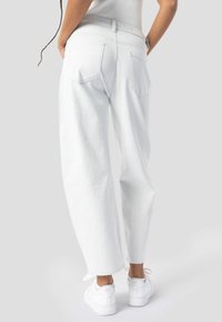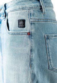 Personne portant un jean droit taille haute, délavé clair, les mains dans les poches, et des baskets blanches sur un fond gris uni.