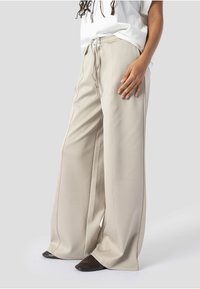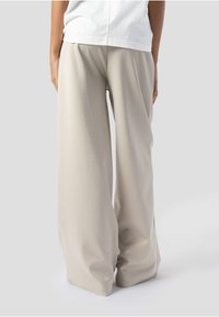 Pantalon beige à jambes larges avec coutures frontales et taille élastique, porté avec un haut blanc et des chaussures foncées à bout pointu, mains dans les poches.