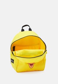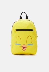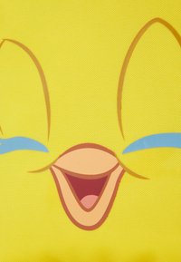 Sac à dos en tissu jaune avec un visage d'oiseau de dessin animé. Il possède des fermetures éclair noires, une poignée supérieure et des bretelles réglables. Design compact.