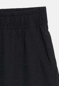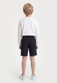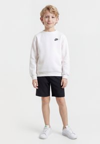 Garçon blond debout portant un sweat-shirt blanc Nike, un short noir et des baskets blanches sur un fond clair uni.