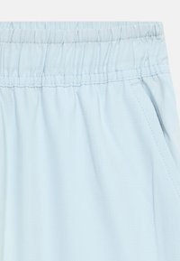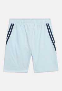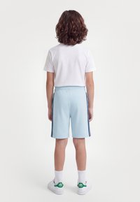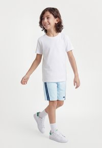 Enfant souriant portant un t-shirt blanc, un short bleu clair avec des rayures marine, des chaussettes blanches et des baskets blanches avec des accents verts, marchant vers l'avant.