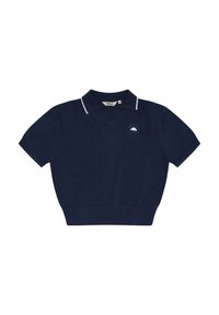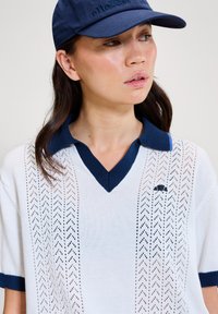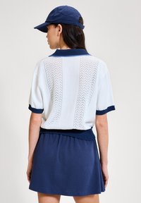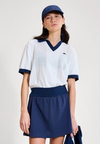 Femme portant un polo en maille blanc avec bordure marine, jupe marine et casquette marine, tenant un vêtement assorti marine dans la main droite.